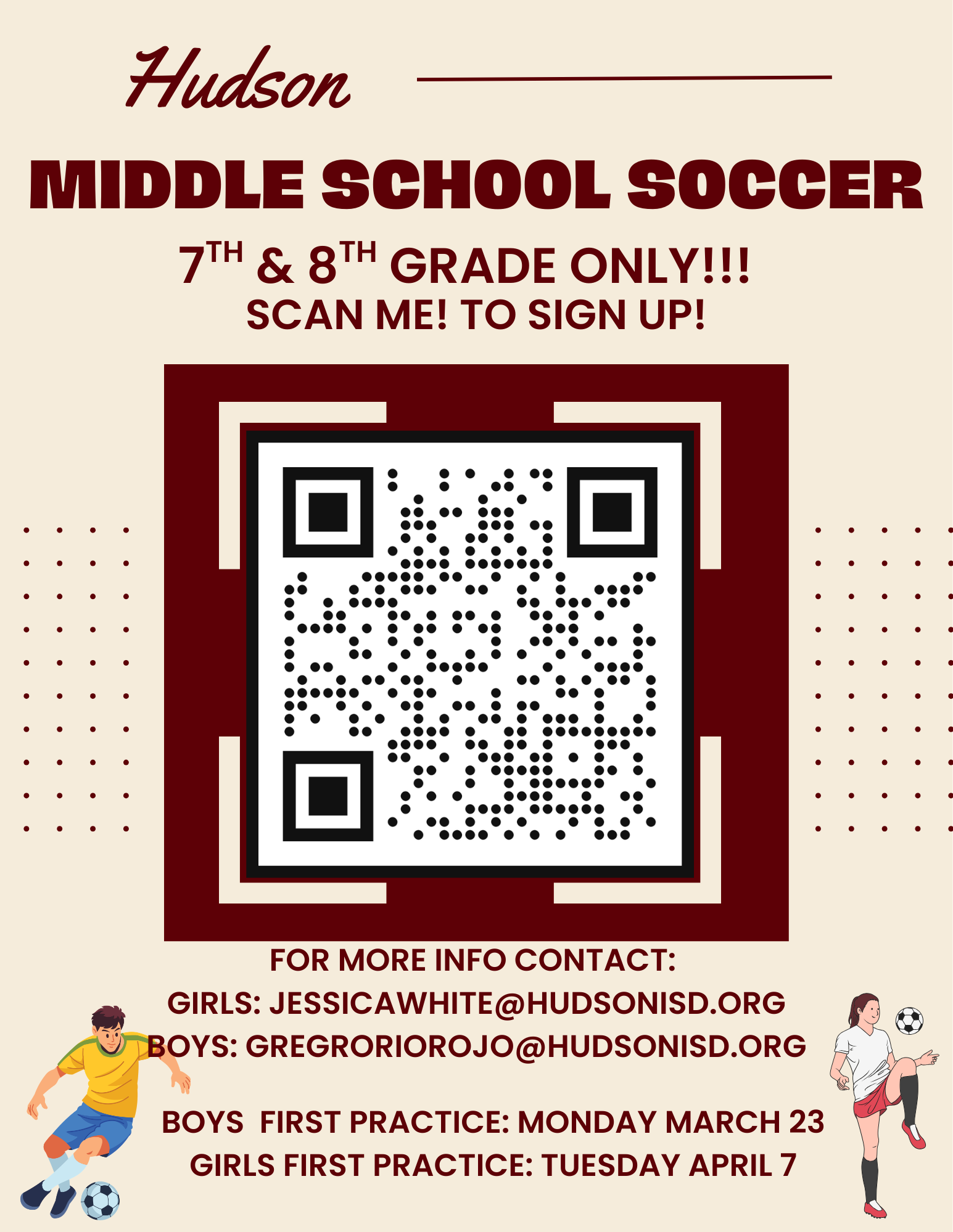 If you are interested in signing up for middle school soccer please scan the QR code below or click on the link below. This is for 7th and 8th graders only!! The cost will be $30 which will go towa...